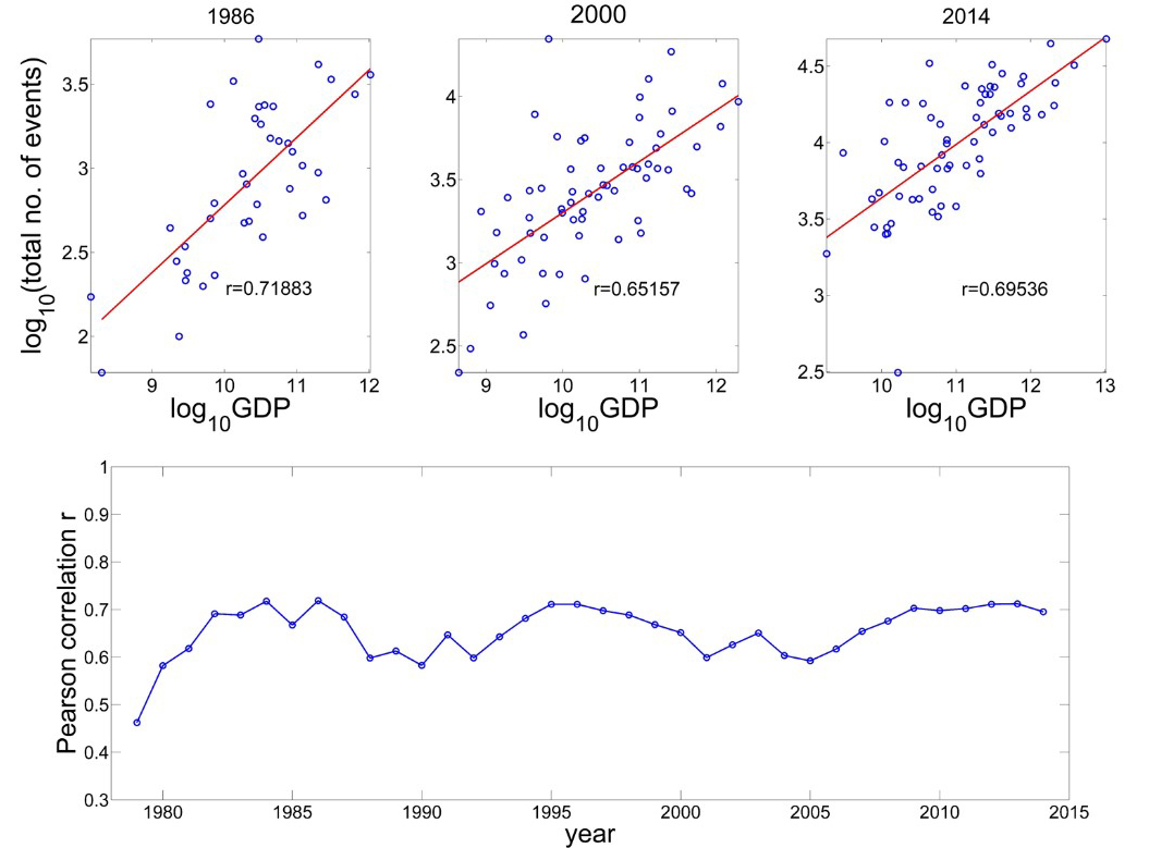 全球事件、语言和语调数据库(Global Database of Events,Language,and Tone,GDELT)为该命题的研究提供了强有力的数据支撑。GDELT是一个TB量级的基于新闻媒体报道的关于全世界所有重要人类社会活动事件集的数据库。它收集的新闻事件覆盖了全世界绝大部分的英语和非英语(100多种语言)国家和地方新闻媒体的报道,新闻覆盖率高达98.4%。该数据库包含了从1979年1月1日至今来自世界的超过6亿条新闻事件数据;且数据库现在已更新到2.0版,实现每15分钟更新一次。该数据库记录的每个事件均涉及两个Actor,如美国和中国。具体地,每个Actor又包含了多种角色代码。更重要的是,GDELT包含了其记录事件的很多其他属性,其中用以刻画两个Actor之间合作或冲突程度的戈登斯坦因子(Goldstein Scale)能够用来研究国家间的政治关系,其分值范围为[−10,10],−10和10分别代表最强烈的冲突和最积极的合作。关于该数据库更详细介绍请见高剑波著《“一带一路”大数据定量分析—任务、挑战与解决方案》一书。我们研究发现基于GDELT的新闻报道的事件数的对数与GDP的对数之间的存在着很好的线性相关性,见图1。这表明不仅海量媒体数据与经济是紧密耦合的,而且新闻报道的很多属性以幂律方式依赖于GDP。因此,GDELT海量媒体数据能够很好地用来研究政治与经济。