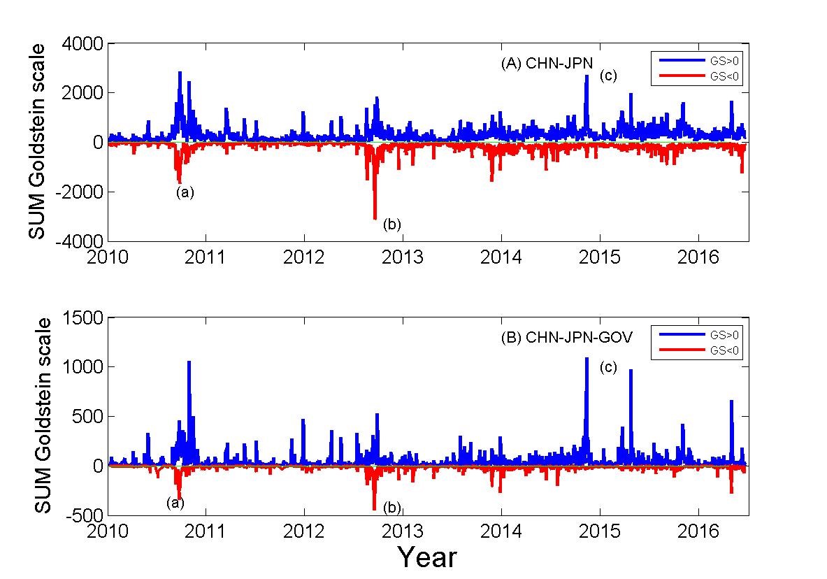 图2(a)中c时刻的戈登斯坦因子为+2701.1,而(b)中c时刻戈登斯坦因子为+1092.1。这个时间节点对应了“习安会”回应2014年中日关系合作事件。自2012年9月以来,两国关系似乎陷入深冷状态。直到2014年11月10日至11日在北京召开APCE会议,中日双方就处理和改善中日关系达成四点原则共识;且日本首相安倍晋三11日下午召开新闻发布会,会上提到“改善日中关系迈出的一大步”,尽快构建日中海上联络机制。由此可见,两国之间发生的重大事件都能在图2中一一对应。那么,将图2中的数据与上文冯昭奎的观点对比,发现2010年9月的冲突事件并未使得两国关系“发展到接近‘全面崩溃’坏到不能再坏的状态”。事实上,从图2能观察到,2012年9月发生的两起重大事件才是近七八年来中日关系到达冰点的危机事件。