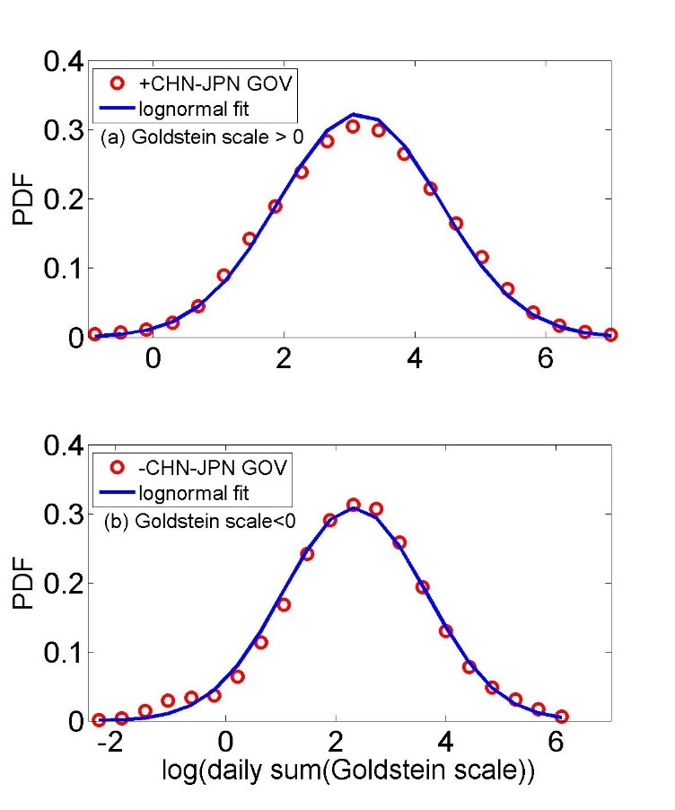 由中心极限定理推断,lnX近似服从正态分布,也就是说X近似服从对数正态分布。中日两国政府间每天的合作和冲突的戈登斯坦因子总和均近似服从对数正态分布,说明政府之间,不管是合作还是冲突,实际决策时,一般考虑了发生的所有相关事件的影响,而不是基于单个或少量事件。