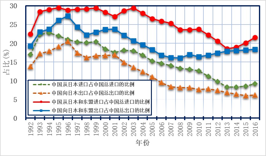 图5. 1992-2016 年中国与日本及中国与日本、东盟之间的贸易情况